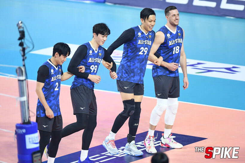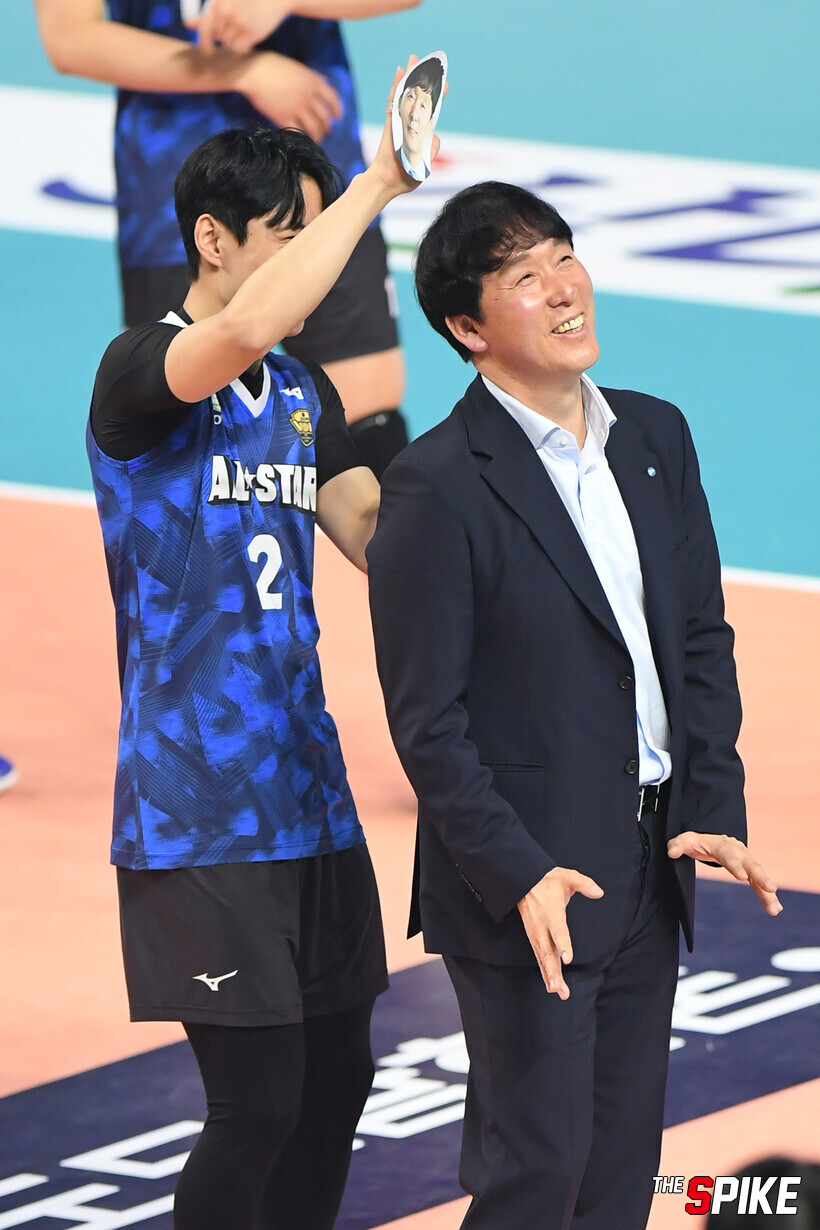 도드람 2023-2024 V-리그 올스타전이 27일 인천 삼산체육관에서 치러졌다. 지난 시즌과 달리 2세트 21점제로 경기가 치러지는 가운데, 1세트에는 남자부 선수들이 코트를 밟았다. K-스타에서는 한선수‧레오나르도 레이바 마르티네스(등록명 레오)‧바야르사이한 밧수(등록명 바야르사이한)‧임성진‧신영석‧임동혁‧료헤이 이가(등록명 료헤이)가 선발로 나섰고, V-스타에서는 잇세이 오타케(등록명 잇세이)‧허수봉‧김지한‧박경민‧한태준‧전광인‧최민호가 선발로 나섰다.
