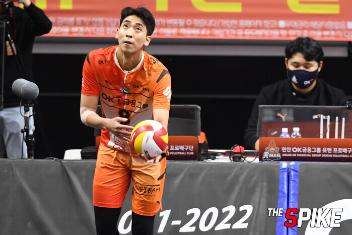석진욱 감독이 이끄는 OK금융그룹은 30일 안산상록수체육관에서 열린 도드람 2021-2022 V-리그 남자부 5라운드 한국전력과 경기에서 세트스코어 3-1(21-25, 25-17, 25-19, 25-19)로 이겼다. 승점 3점을 추가한 OK금웅그룹(승점 31점 12승 13패)은 삼성화재(승점 29점 10승 14패)를 최하위로 내리는 데 성공했다.