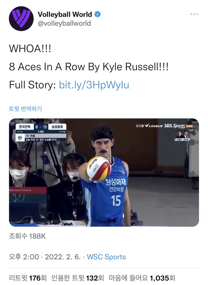 국제배구연맹(FIVB)도 V-리그 삼성화재 카일 러셀의 서브 기록에 주목했다.