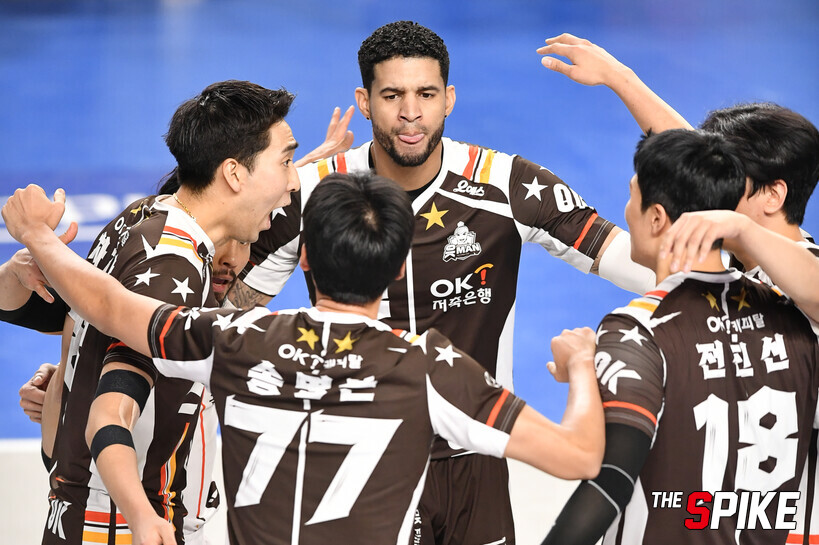 현대캐피탈이 1일 천안 유관순체육관에서 열린 도드람 2022-2023 V-리그 남자부 5라운드 OK금융그룹과의 맞대결에서 세트스코어 3-1(25-22, 25-22, 17-25, 25-18)로 승리했다.