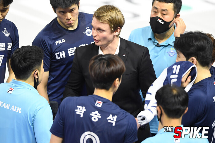 토미 틸리카이넨 감독이 이끄는 대한항공은 20일 인천계양체육관에서 열린 도드람 2021-2022 V-리그 남자부 4라운드 KB손해보험과 경기에서 세트스코어 3-0(25-22, 25-21, 25-19)으로 승리했다.