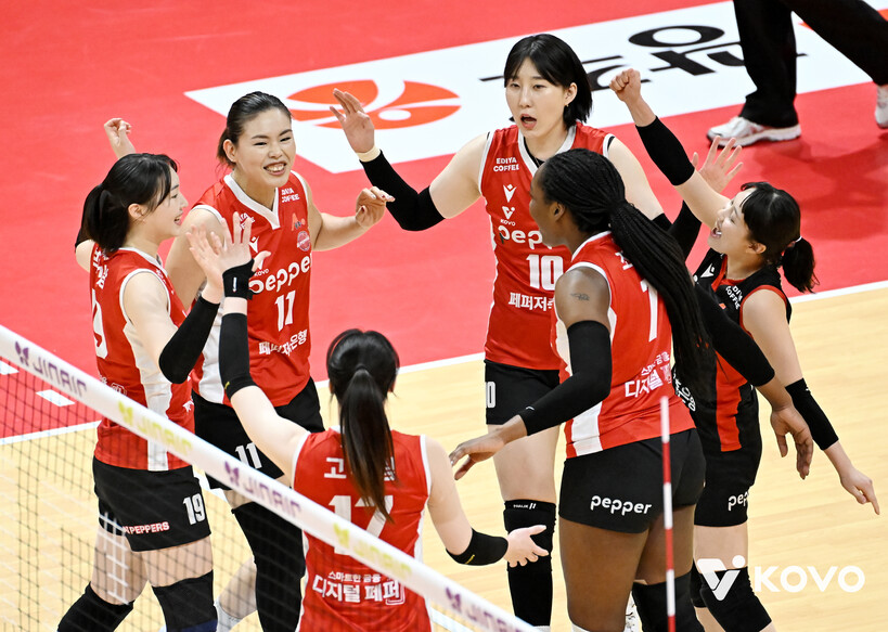 페퍼저축은행은 좋은 흐름을 탔다. 4세트 초반 고예림과 조이의 공격을 앞세워 점수를 쌓았고 20-9까지 치고 나가며 승기를 굳혔다. 세트 후반에는 박은서의 서브가 효과를 봤다.