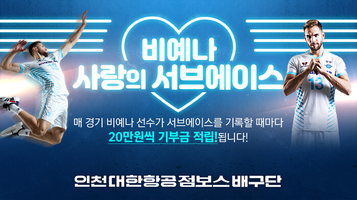 대한항공은 25일 보도자료를 통해 지난해에 이어 인하대병원과 함께 도드람 2019~2020 V-리그에서 외인 비예나가 서브에이스 기록을 세우면 1점당 대한항공 10만 원, 인하대병원 10만 원 총 20만원을 기부한다고 밝혔다.