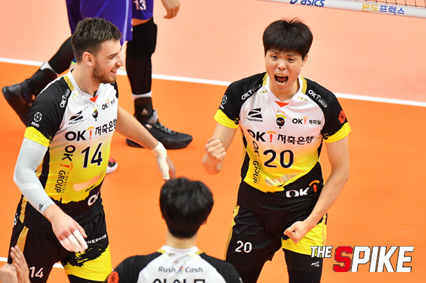 [더스파이크=안산/서영욱 기자] OK저축은행의 두 젊은 미들블로커가 팀의 3연승을 이끌었다.